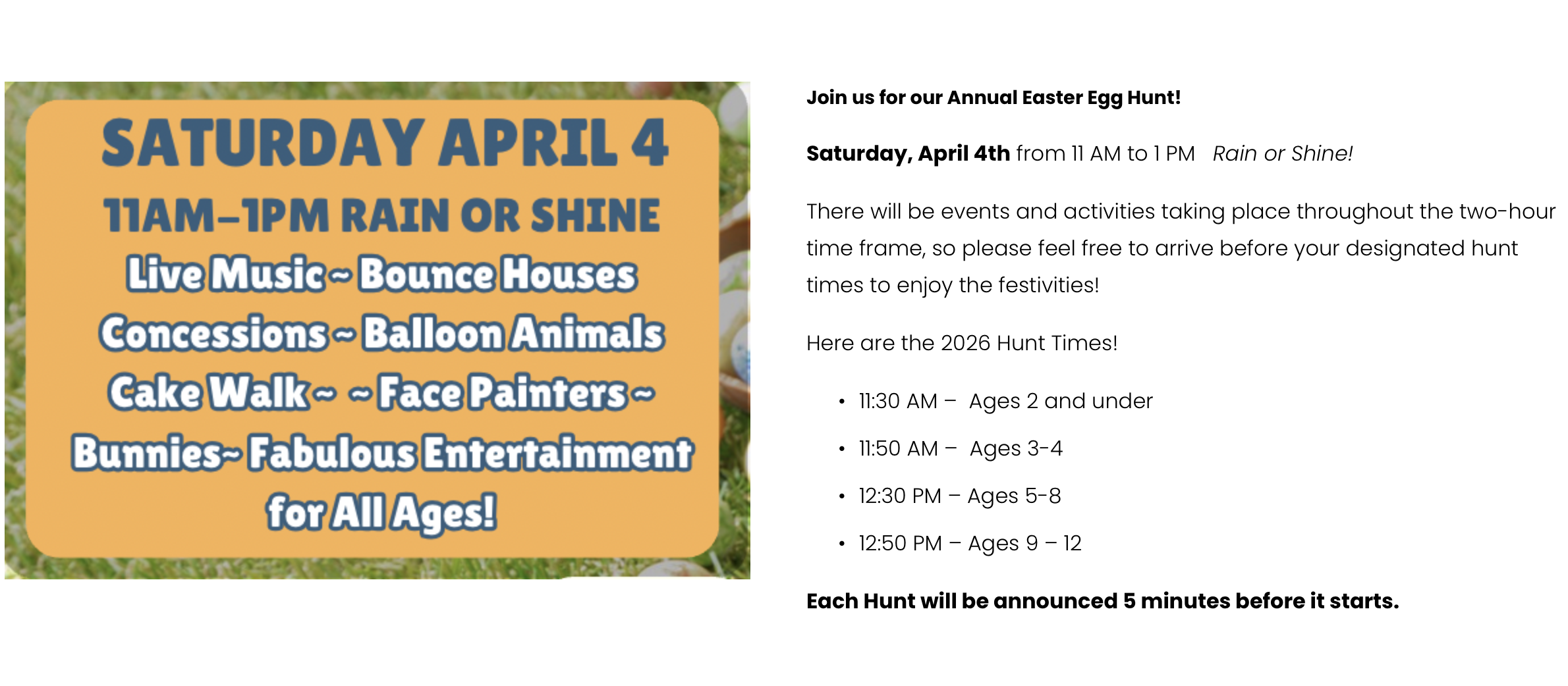 April 4 Falmouth Congregational Church Easter Egg Hunt. 11 AM - 1 PM. All are welcome — sign up here.